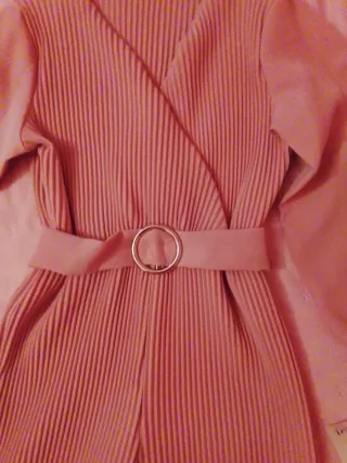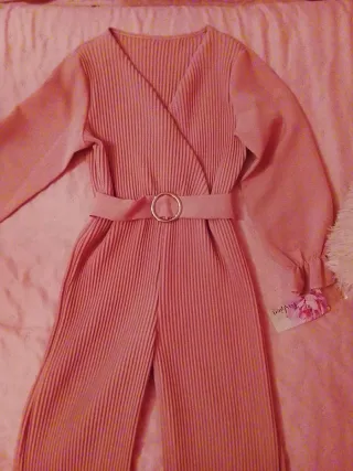 Mono elegante de color rosa con un diseño plisado y cinturón. - Manga larga. - Cuello en V. - Cinturón con hebilla redonda. - Piernas anchas.