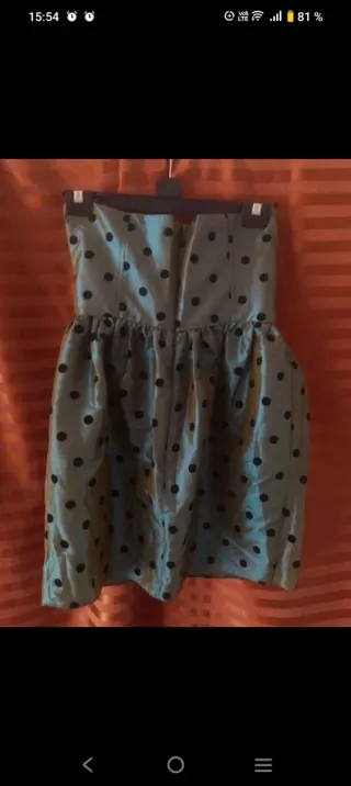 Minivestido palabra de honor de lunares, talla 38, de "Topshop". Nuevo sin usar. Cremallera trasera, en tonos verde caqui-azulados tornasolados, tejido satinado. Cuello en corazón y falda de vuelo. Lo vendo por 3'50€. Hago lotes con cualquiera de los artículos de mi armario y negocio precios. Hago ventas en zona Centro Madrid, me desplazo si es necesario. Gracias!