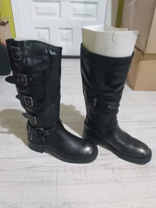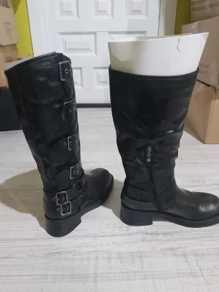 Botas NUEVAS de caña alta con un diseño moderno y detalles metálicos. Tres correas decorativas con hebillas. Puntera con acabado plateado. Medidas aproximadas: Tacon 4,5 cm Alto 38 cm. Caña superior ancho 20 cm