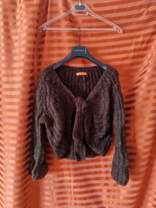 Chaqueta-cárdigan corto de punto acrílico mullido marrón chocolate, con lazada central ajustable, en talla única, de la marca César Amadeus. Presenta algo de desgaste como pelotillas y pelusas típicas del tejido. A la venta por solo 1'65€. Hago lotes con cualquiera de los artículos de mi armario y negocio precios. Hago ventas en persona y envíos. Gracias!