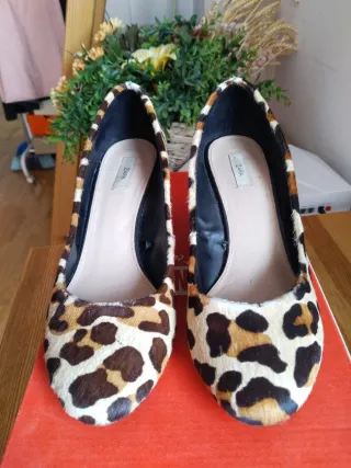 Zapatos de tacón de cuña, estilo pelo de estampado animal, en talla 40, de Zara. Usados un para asistir a un par de bodas únicamente, por lo que están en muy buenas condiciones, salvo por la suciedad de la suela y alguna manchita pequeñita y ligeras marcas de los dedos en las plantillas. A la venta por 8'50€ (me voy de Madrid el día 22 y vuelvo el día 7 de enero, así que tendría que ser en estos tres días o ya a mi regreso). Hago lotes con cualquiera de los artículos de mi armario y negocio precios. Hago ventas en persona y envíos. Gracias!