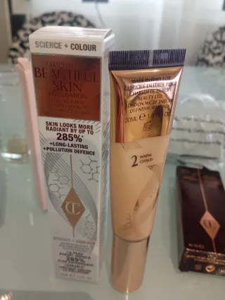 Base de maquillaje Charlotte Tilbury Airbrush Flawless. - Tono beige con detalles dorados.bases diferentes nuevas