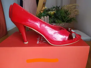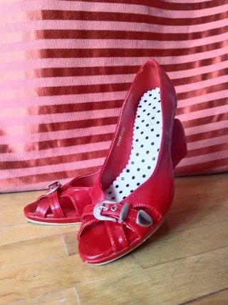Zapatos de charol de tacón con la puntera abierta, de la marca "Allegra", en talla 40. Han sido usados unas cuantas veces por lo que presentan desperfectos -ver fotos- y necesitarían una reparación, por lo que se venden por tan solo 1€ (me marcho de vacaciones el día 22 y vuelvo el día 7, por lo que tendría que ser durante este par de días o ya mi regreso). Hago lotes con cualquiera de los artículos de mi armario y negocio precios. Hago ventas en persona y envíos. Gracias!