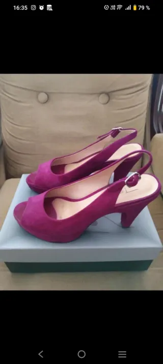 Zapatos de fiesta, estilo Peep Toe, con tacón y plataforma, de ante, talla 40, de la marca "To Be". Alta calidad. Morados/fucsias según la luz. Muy cómodos. Usados pocas veces, si bien tienen ligeros desperfectos propios del uso y necesitarían una limpieza, por lo que se venden por tan solo 4'50€ -constaron 94€- (me voy de vacaciones el 22 y vuelvo el 7, por lo que tendría que ser este par de días o ya a mi vuelta). Hago lotes con cualquiera de los artículos de mi armario y negocio precios. Hago ventas tanto en persona como envíos. Gracias!