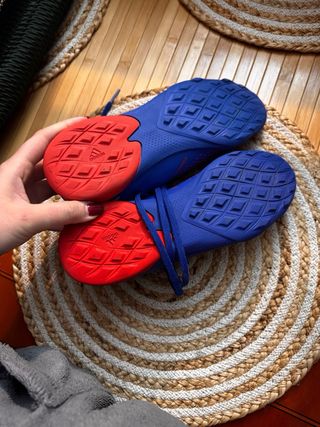 Botas de fútbol Adidas Predator en llamativos colores azul y rojo. Diseñadas para un buen agarre y control en la cancha. - Diseño de media caña. - Cierre con cordones. - Detalle de tres rayas. - Logo Predator en el lateral.