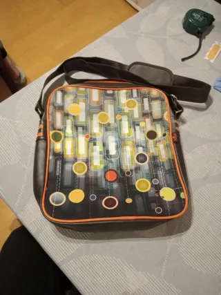Bolso bandolera con un diseño llamativo y moderno. Medidas : 30 x 27x 7 - Estampado geométrico con círculos. - Ribete en color naranja.