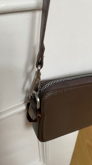 Bolso bandolera con un diseño moderno y llamativo. - Combinación de colores mostaza y marrón. - Detalle central con estampado de serpiente. - Panel lateral con perforaciones. - Correa ajustable para llevar al hombro o cruzado.