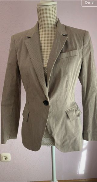 Chaqueta marca Walbusch, marca alemana, color beige con detalles en cuero marrón, forrado en el interior con tela a rayas blancas y rosas, con los logotipos de la marca en botones, manga, etc. Una prenda de calidad. Prácticamente nueva. Talla M aproximadamente. Un básico versátil para tu armario. - Diseño con múltiples bolsillos. - Cierre de cremallera. - Forro interior a rayas blancas y rosas.