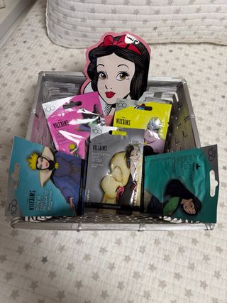 Cesta con varias mascarillas faciales de Disney. - Incluye personajes de Villanos y Princesas. - Variedad de tratamientos como scrub y detox. - Diseños de personajes icónicos.