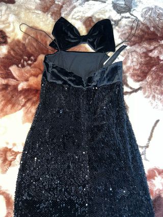 Vestido corto con detalle de lazo de terciopelo y falda de lentejuelas. - Tirantes finos - Diseño con lazo frontal - Falda con lentejuelas brillantes