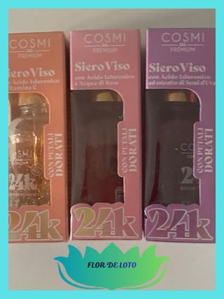 Sueros faciales de 24k de la marca Cosmi Premium - Cada uno contiene 24k y Acido hialurónico. De uva , Vitamina C y Aqua de Rose Precio por unidad. En mi perfil tengo más productos de belleza integral para mujeres y hombres , por si te apetece hacer lotes!! Cualquier duda o consulta a vuestra disposición Muchas Gracias!! 🪷