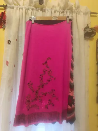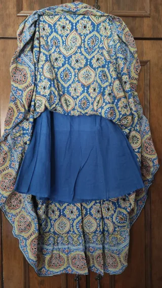 Falda larga de algodón con un bonito estampado bohemio y detalles de espejos. Con faldilla de algodón azul en el interior. - Diseño con volantes. - Cintura elástica. - Adornada con borlas.