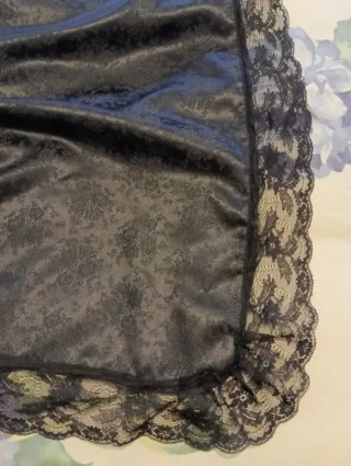 Mandil negro con un elegante diseño adamascado y una bonita puntilla alredor Largo 93cm, ancho 108cm contando la puntilla, cintura 73 cm