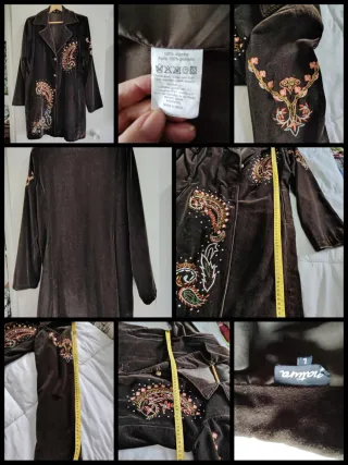 Elegante abrigo de terciopelo con un bonito bordado. - Material: 100% algodón y 100% poliéster. - Fabricado en India. - Cierre de botones.