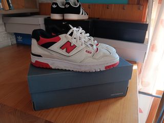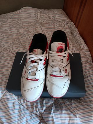Zapatillas New Balance 550 con un diseño deportivo y llamativo. - Combinación de colores blanco, rojo y negro. - Detalle del número 550 en el lateral. - Logo de New Balance en la suela.
