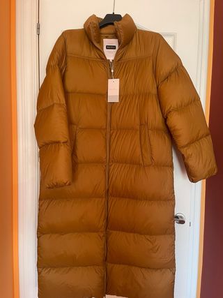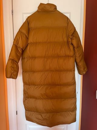 Abrigo largo de plumas para mujer, muy ligero y en un bonito color camel. Ideal para mantenerte abrigada con estilo. - Sin estrenar. - Diseño largo 120cm y acolchado. - Cremallera frontal. En la etiqueta pone talla 36 pero corresponde a una L.