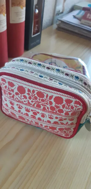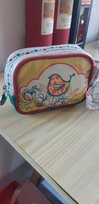 Práctica bolsita de aseo con un encantador diseño. - Estampado de pájaro y flores. - Cierre de cremallera. - Ribete decorativo.