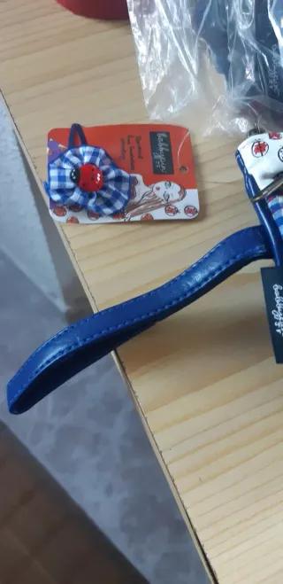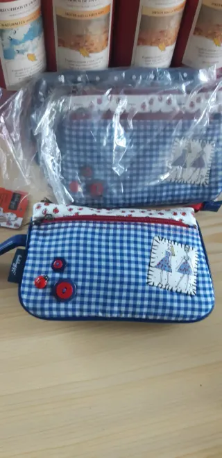 Conjunto de bolsito y horquilla con un diseño encantador. - Estampado de cuadros vichy azul. - Detalles en rojo y con mariquitas. - Parche decorativo con figuras. - Cierre de cremallera.