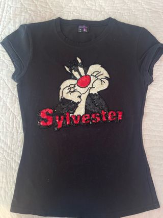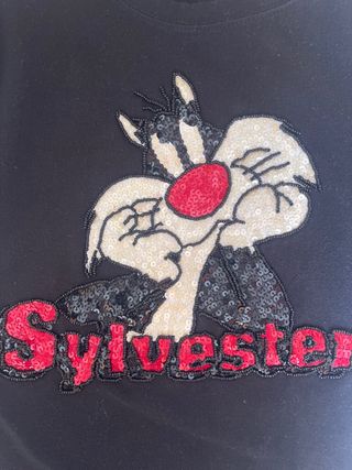 Camiseta negra de Bershka con un divertido diseño de Silvestre. - Personaje de Silvestre con detalles de lentejuelas y abalorios. - Nombre Sylvester bordado con lentejuelas rojas. En etiqueta talla M, pero es más bien S, adjunto medida en fotos