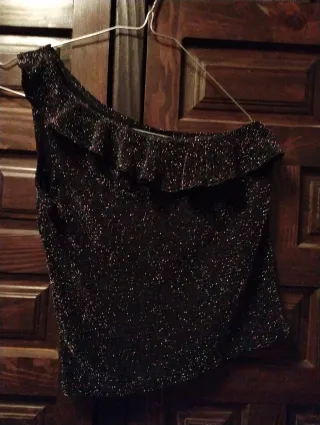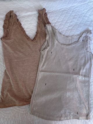 Lote de dos camisetas de tirantes, talla S. Una de ellas es de color marrón con un bonito detalle de volantes en el escote. La otra está adornada con lentejuelas. - Camiseta marrón con volantes. - Camiseta plateada con lentejuelas.