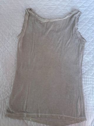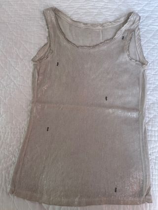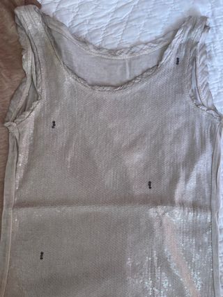 Camiseta sin mangas con un diseño de lentejuelas que aporta un toque brillante. - Color beige y plateado. - Talla S.