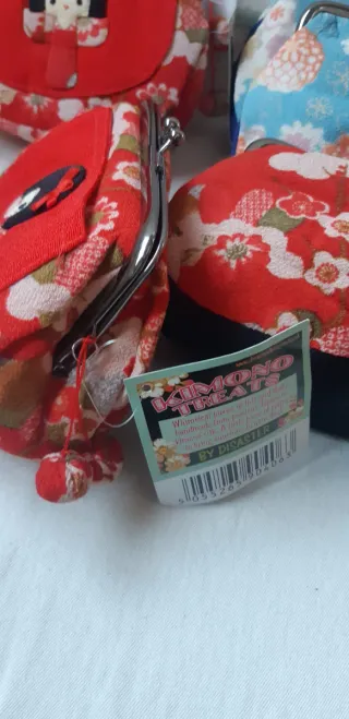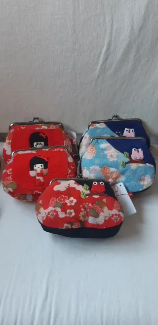 Conjunto de bolsitos o monederos de tela con diseños variados. - Uno de ellos es de color azul con motivos florales y dos búhos. - Otro es rojo con un estampado floral y una figura de niña. - El tercero es rojo con un estampado floral y una figura de rana. - Cuentan con cierre de boquilla metálica.