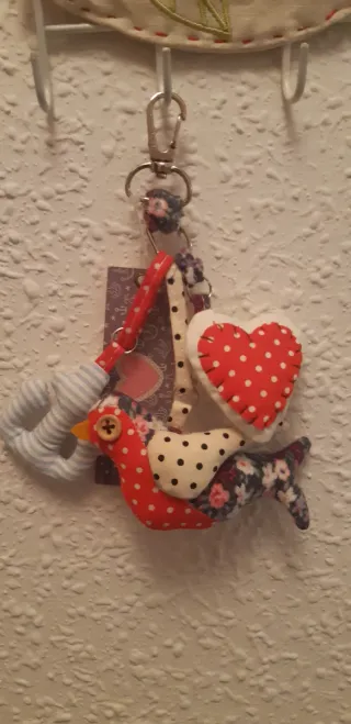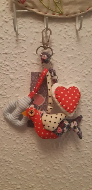 Lindo llavero para bolso con un diseño de pájaro y corazón. - Pájaro de tela con estampado de lunares y flores. - Corazón de tela con estampado de lunares rojos. - Adornos de tela a rayas y con flores.