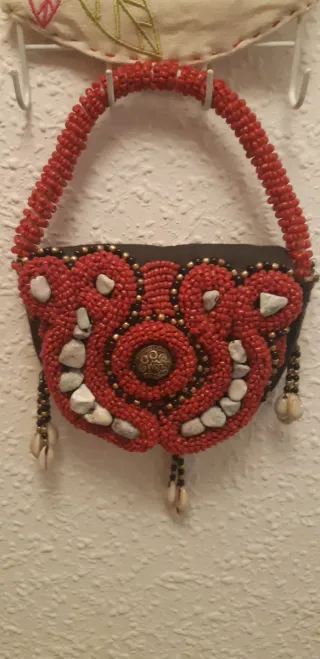 Bolso artesanal con un diseño étnico y llamativo. Perfecto para añadir un toque único a tu estilo. - Elaborado con cuentas rojas y detalles dorados. - Adornado con pequeñas piedras naturales. - Cuelgan detalles de conchas marinas en la parte inferior.