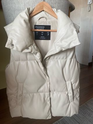 Chaleco acolchado de cuello alto en tono crema. - Diseño sin mangas. - Cierre de botones a presión y cremallera. - Bolsillos delanteros con solapa y botón. Bastante calentito. lo vendo porque me cogí una talla menos y se me pasó el plazo de devolución.