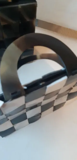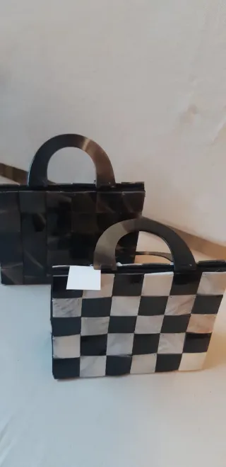 Conjunto de dos bolsos de mano con diseño de cuadros. - Un bolso es completamente negro. - El otro bolso combina cuadros blancos y negros. - Ambos tienen asas rígidas.