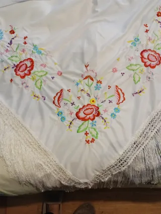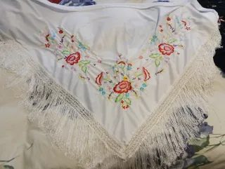 Precioso mantón a pico blanco con un delicado bordado floral multicolor. Ideal para complementar cualquier atuendo. Mide 165 de largo y 105*105 de pico más los flecos - Adornado con flecos blancos.