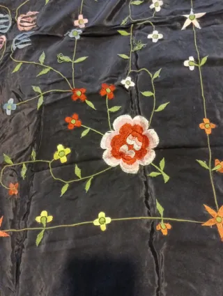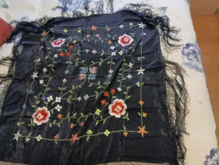 Elegante mantón antiguo con un intrincado bordado floral. - Diseño de flores y hojas en tonos vivos. Mide 105*105 más los flecos, muy bien conservado