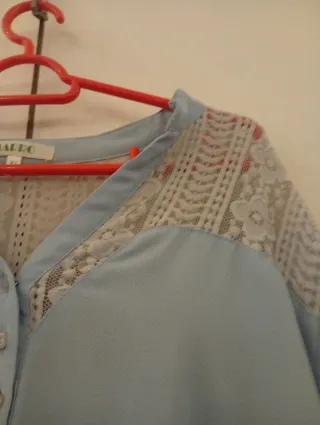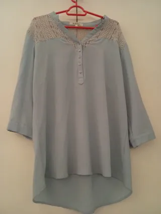 Elegante blusa de manga larga con detalles de encaje en los hombros y cuello. - Cuello en V con botones. - Diseño asimétrico en el bajo. - Tejido ligero y fluido.