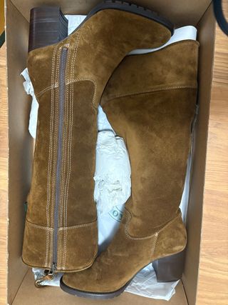Botas altas de ante color marrón. - Cierre de cremallera lateral. - Tacón grueso. - Detalle de costuras.