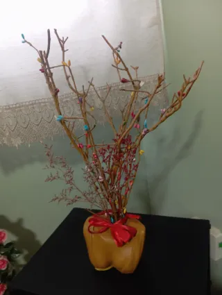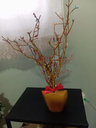 Este adorno decorativo está hecho de ramas secas y adornado con pequeñas cuentas de colores. - Ideal para colgar joyas o como decoración. - Base en forma de maceta dorada. - Lazo rojo decorativo.