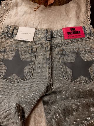Pantalón vaquero con detalles brillantes y parche. - Diseño con tachuelas plateadas. - Parche de estrella en la parte trasera. - Etiqueta trasera ONE DILEMMA x STRADIVARIUS.