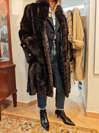 Elegante abrigo largo de pelo en tono marrón oscuro. Una prenda clásica y sofisticada. - Cierre con botones. - Forro interior satinado. - Diseño atemporal. - hombro 48, axila 48, largo 99 aprox.