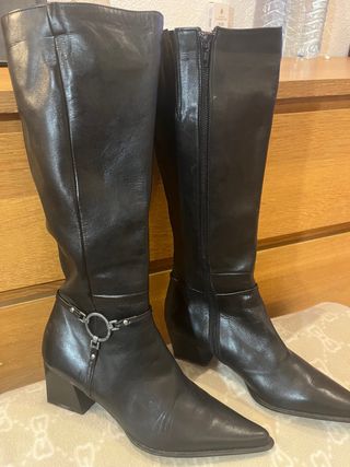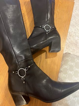 Elegantes botas CañaAlta de piel, Extraordinaria MuyBuena y suave comodo tacon cuadrado, perfectas para completar cualquier atuendo. - Material: Piel flor. - Diseño de caña alta. - Tacón con punta afilada. - Adorno metálico en el tobillo. Muy bueno marcaPlumers Menorca