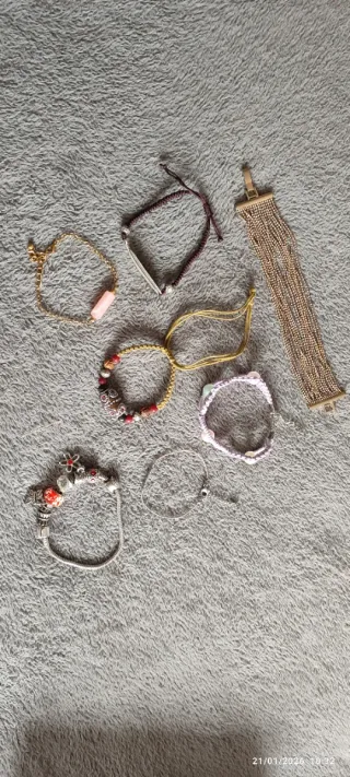 Conjunto de siete pulseras de bisutería variadas. - Diseños y adornos diversos. - Cierre ajustable en algunas piezas.