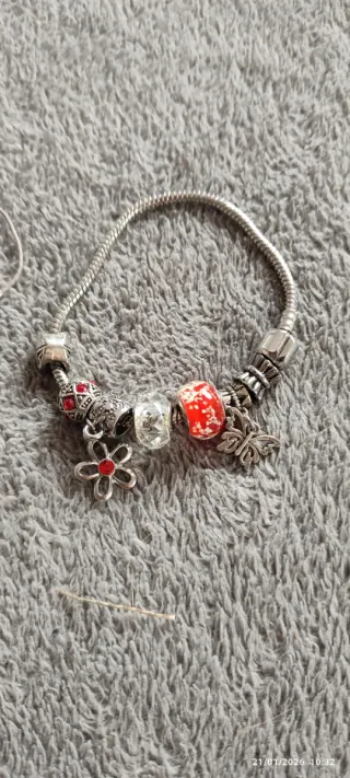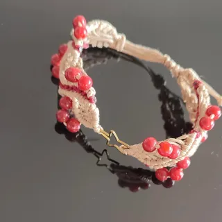 Pulsera artesanal de macramé con un diseño único. - Elaborada con hilos beige y detalles en rojo. - Adornada con cuentas rojas. - Incluye un charm en forma de estrella dorada.