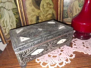 Elegante joyero con un diseño intrincado y detalles en hueso. - Elaborado en metal plateado. - Incrustaciones de hueso en la tapa y los laterales. - Patas decorativas para un soporte estable.