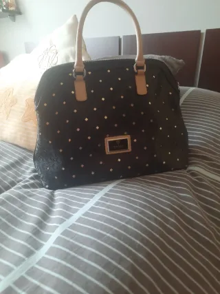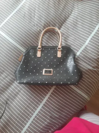 Elegante bolso de la marca Guess con un diseño moderno. - Color negro con detalles en beige. - Estampado de pequeños rombos blancos.