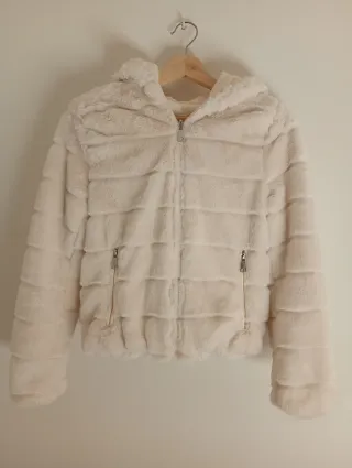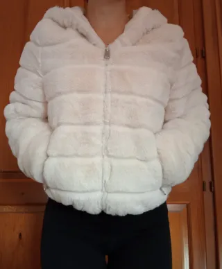 Chaqueta de pelo sintético muy suave y calentita. Cuenta con capucha y cierre de cremallera. - Diseño acolchado. - Bolsillos laterales e interiores. Nunca se ha usado, está nueva.