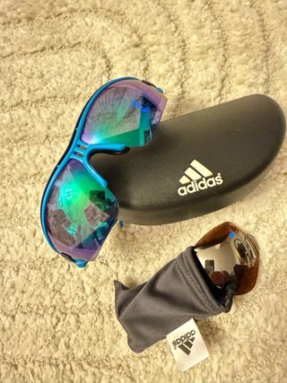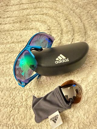 Gafas de sol deportivas Adidas, con un diseño moderno y llamativo. - Montura de color azul vibrante. - Incluye funda protectora.