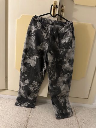 Pantalones casuales con un diseño tie-dye llamativo. - Cintura con cordón ajustable. - Estampado abstracto en tonos grises y blancos.