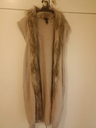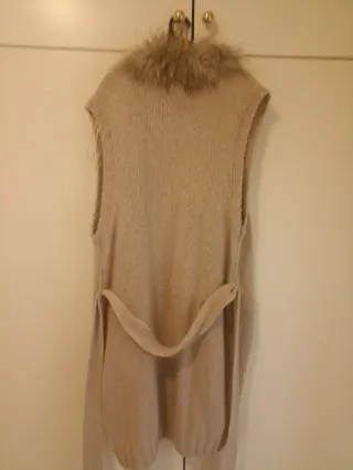 Elegante chaleco largo de punto con detalles de pelo sintético en el cuello y la parte delantera. Perfecto para añadir un toque de estilo a cualquier atuendo. - Diseño sin mangas. - Acabado en punto texturizado. - Adorno de pelo suave.