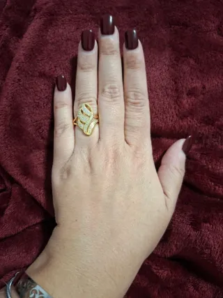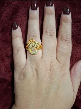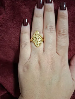 Elegante anillo con un diseño geométrico y detalles brillantes. - Acabado en tono dorado. - Talla ajustable para mayor comodidad. - De Rodio