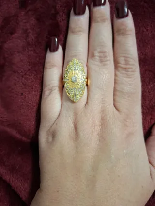Elegante anillo con un diseño llamativo y detalles brillantes. - Diseño ovalado con pedrería. - Detalles que simulan rayos de sol. - Centro con pequeña circonita. - De Rodio