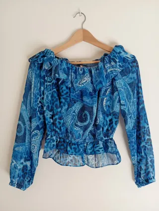 Bonita blusa peplum de la marca Guess con un llamativo estampado. - Diseño con volantes en el escote. - Manga larga. - Cintura elástica con detalle fruncido. Está nueva nunca la he llevado.