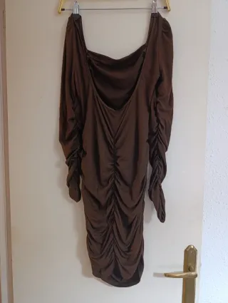 Vestido marrón con un diseño fruncido. - Escote cuadrado. - Mangas largas abullonadas. - Tejido elástico. - Largo hasta la rodilla.